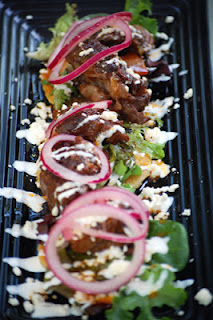 Begin by placing your sopes down first. I used spring greens and layed them down on top of each sope. Then I put a piece of short rib meat on top of that! Crumble a little Cotija cheese on top of that, then drizzle with some Mexican Crema. The final step is placing some of those pickled onions as the garnish.